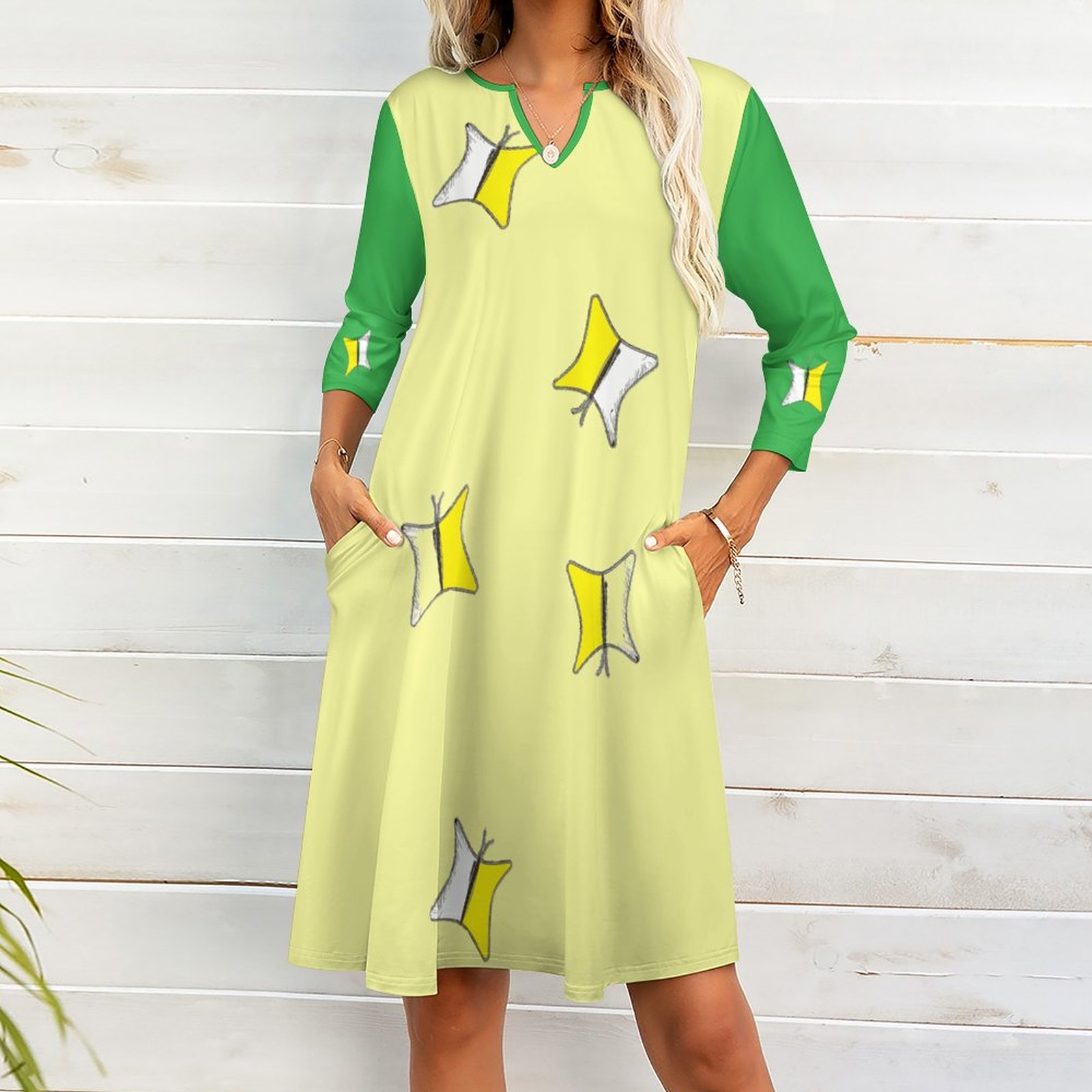 - Quality fabric: Neither pilling and nor fading, the polyester and spandex fabric is comfortable-to-wear for long-term wearing, with thoughtful pockets: Excellent for your leisure time, this classic-style 3/4 Sleeve Dress is never out of date and can stand the test of time. Show your charm: Printed with distinctive patterns, the V-neck 3/4 Sleeve Dress with Pockets makes you stylish, charming and confident.
