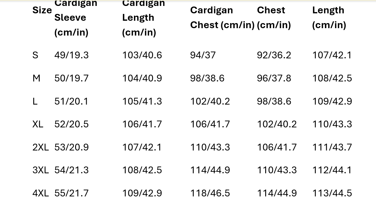 | Size | Long Cardigan Sleeve (cm/in) | Long Cardigan Length (cm/in) | Long Cardigan Chest (cm/in) | Dress Chest (cm/in) | Dress Length (cm/in) |
