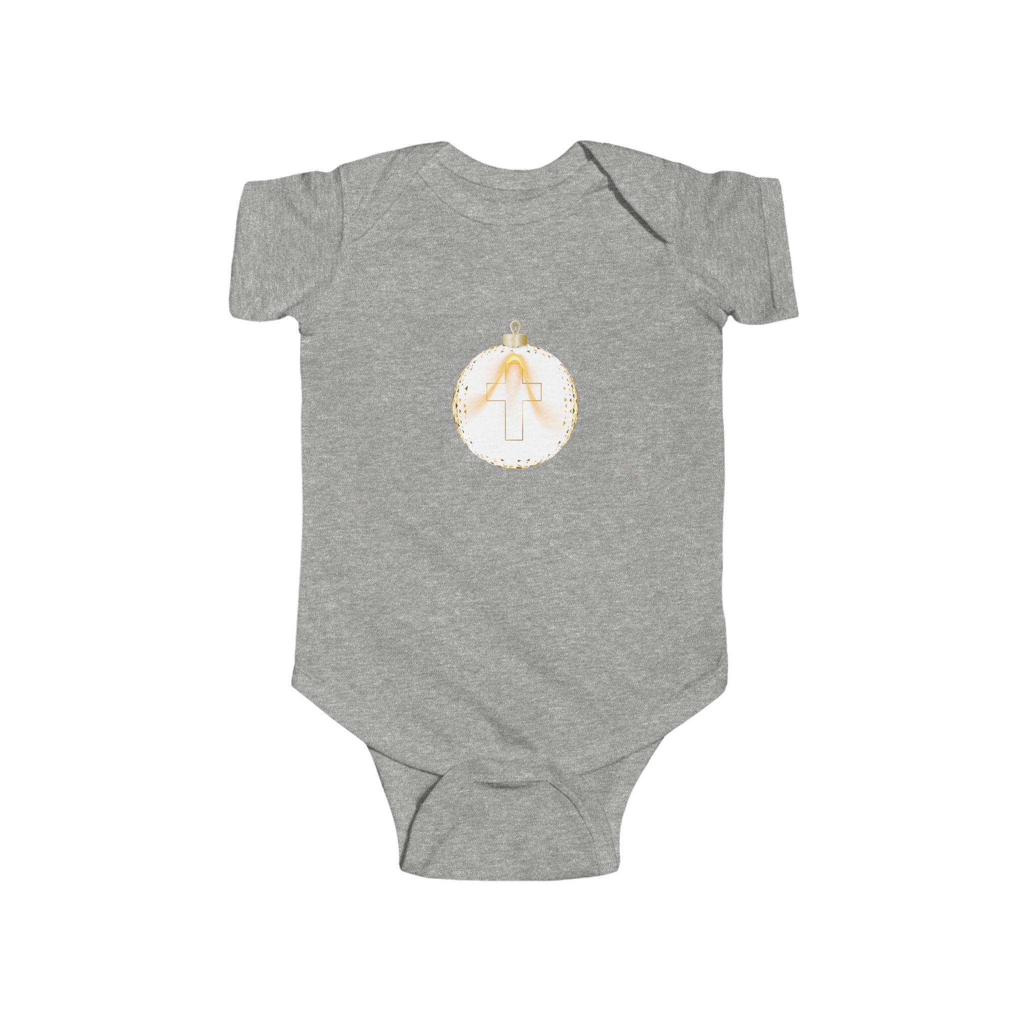 Soft, breathable infant bodysuit with a gentle, hand-drawn gold ornament motif at the chest. The lightweight combed ringspun cotton feels smooth against delicate skin, while ribbed knit binding at the neck and sleeves lets tiny arms move freely.