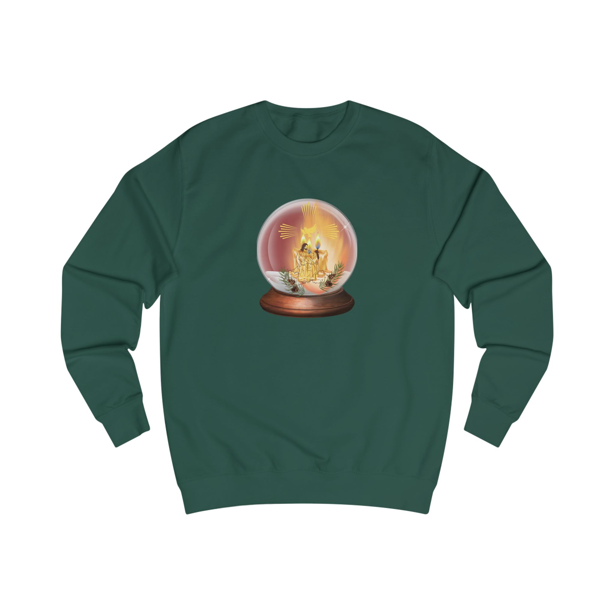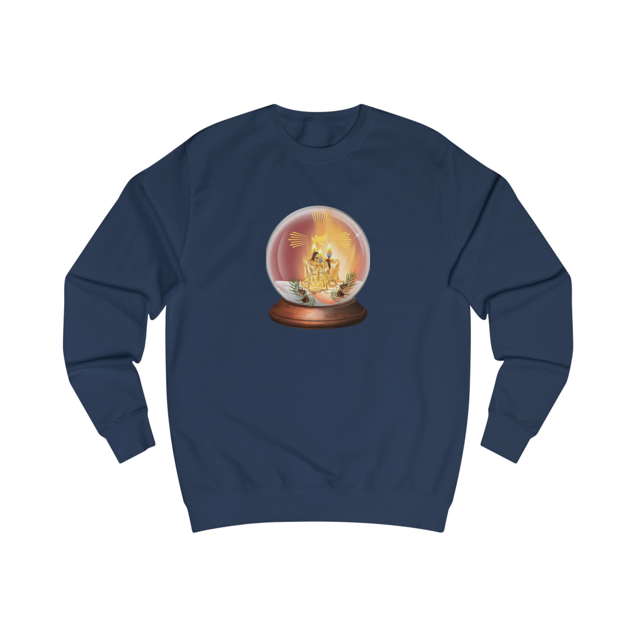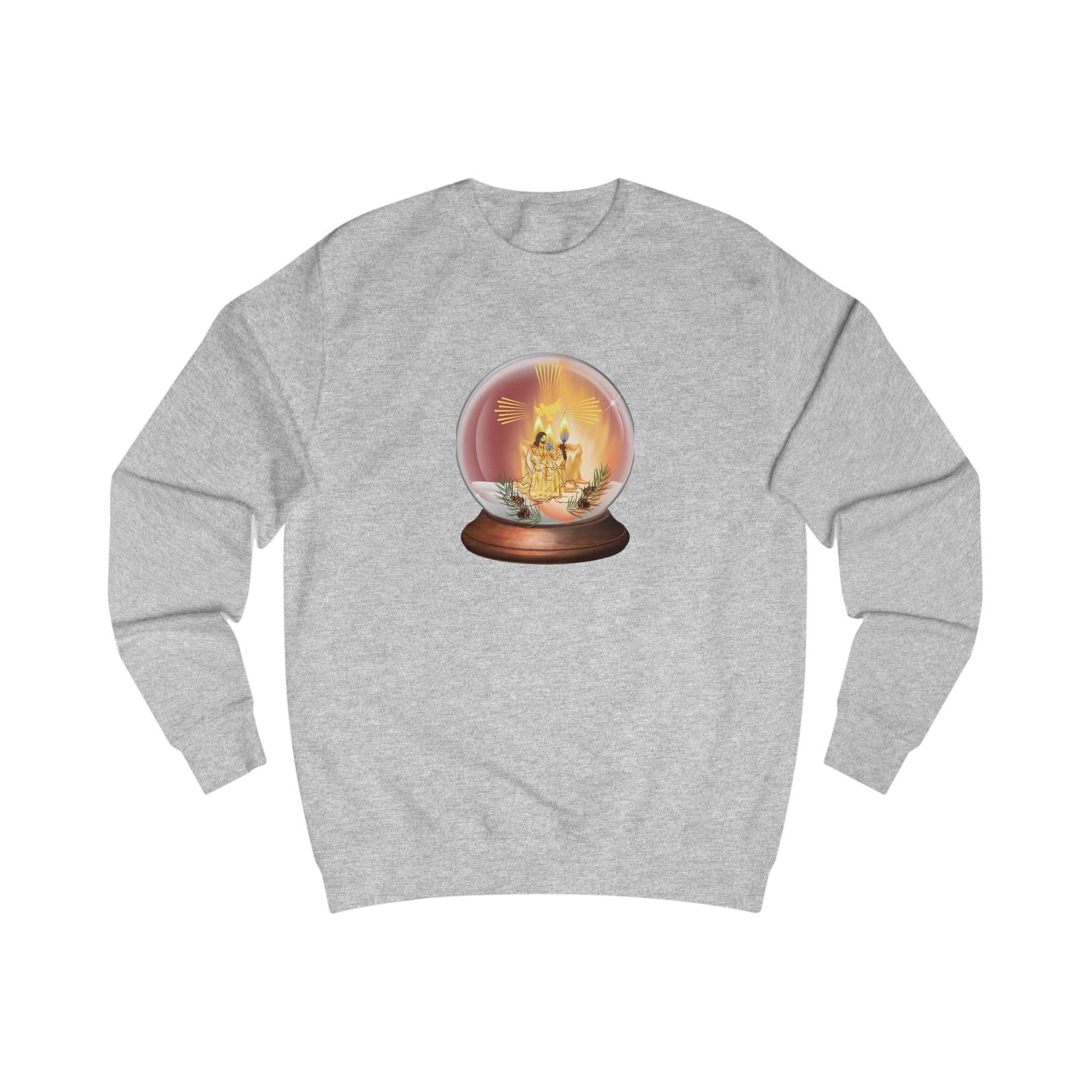 This cozy sweatshirt carries a small, nostalgic scene—an ornate snow-globe-like dome holding a warm, golden candlelight with Jesus’ image. The artwork glows against the soft fabric, inviting quiet evenings by the fire and slow conversations.