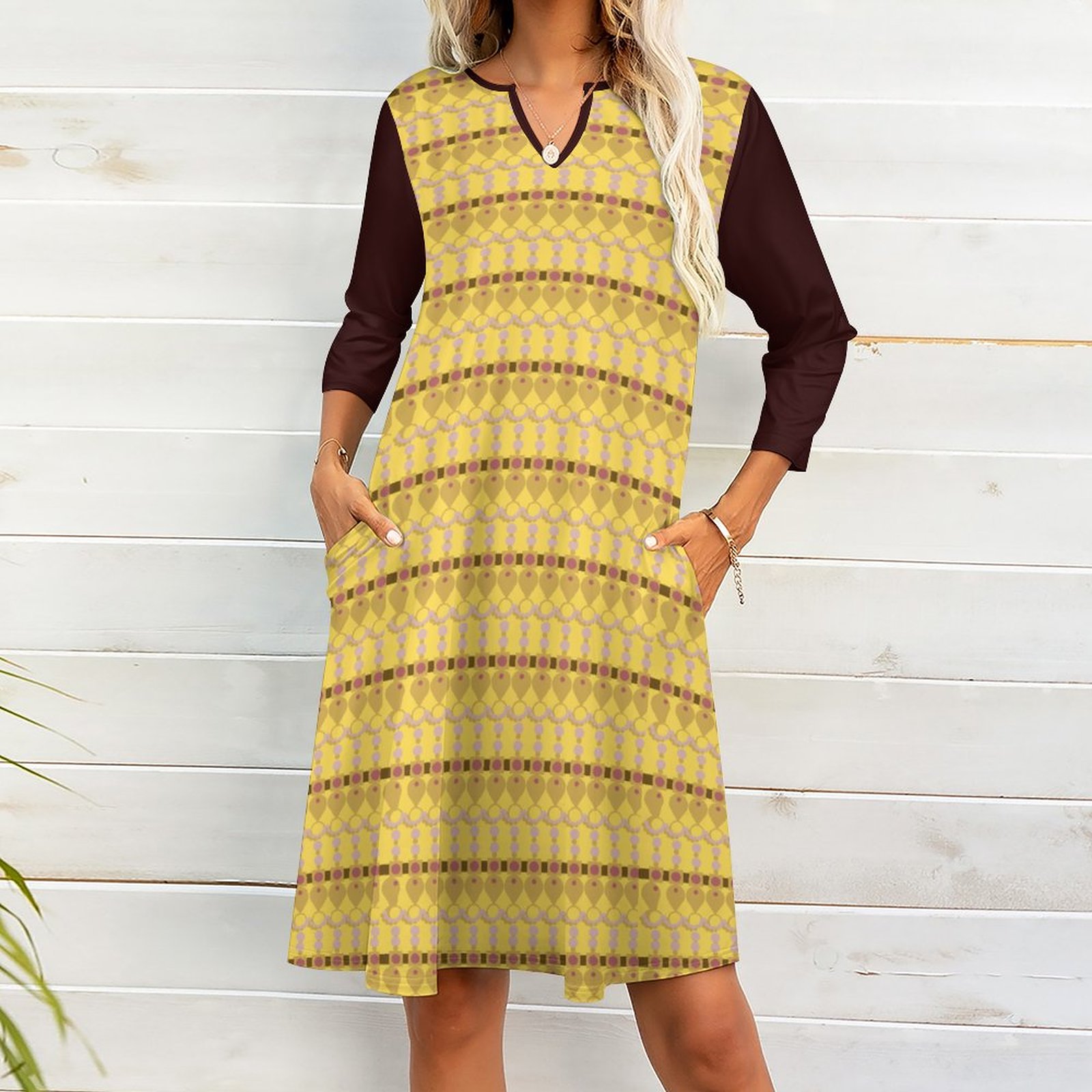 Ethnic Jewel Pattern Yellow-V-neck 3/4 Sleeve Dress with Pockets